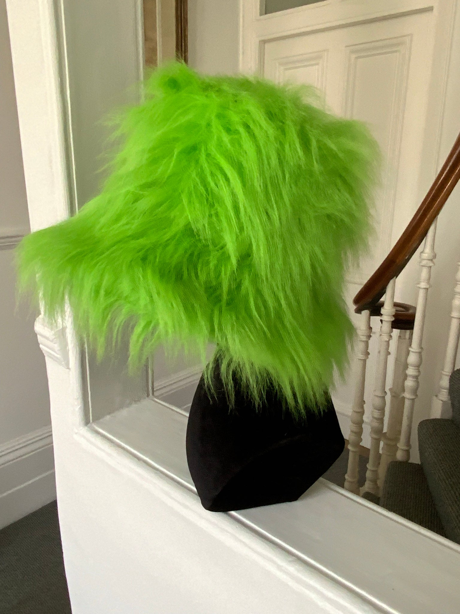 Neon Green long pile, modacrylic, acrylic, polyester mix outer fabric, with cotton lining. One size (52 - 55cm diameter approx) with the inside elastic band to adjust the size